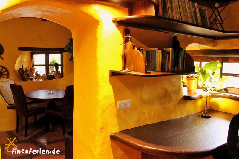 Die Finca verfügt über drei Schlafzimmer, die nach kanarischer Tradition vom Patio (Innenhof) abgehen. Zwei der Schlafzimmer haben gemauerte Doppelbetten und je 1 Bad en Suite. Die Küche ist modern ausgestattet mit Ceranfeld, Geschirrspüler, Mikrowelle und großer Kühl-Gefrierkombination. An das gemütliche Wohn- und Esszimmer mit zwei Sofas und Essplatz grenzt ein separater Essbereich, ebenfalls mit großem Tisch, mit gemauerter Sitzbank und zusätzlichen Stühlen. Von diesem Essplatz aus gibt es eine Durchreiche zur Küche. Ein zweites, kleines Wohnzimmer liegt direkt im Eingangsbereich - ebenfalls mit gemauerter Sitzbank, Tisch und Stühlen. Daneben befindet sich ein Arbeits- bzw Spielzimmer mit zwei großen Schreibtischen - perfekt zum Spielen oder auch kreativen Arbeiten.