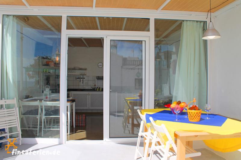 Eine große Glasfront trennt den Wohnbereich von der teilüberdachten Dachterrasse. Hier können Sie beim Frühstücken den wunderbaren Meerblick genießen oder am Abend die Sonnenuntergänge betrachten.