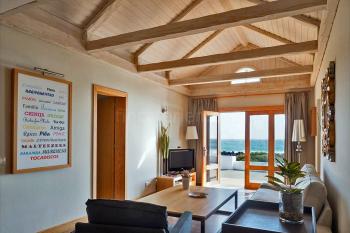 Zur hochwertigen Ausstattung gehören zwei Schlafzimmer, ein Duschbad, eine offene Küchenzeile mit Esstisch sowie ein Wohraum mit SAT-TV und Zugang zur Terrasse. Von Küche, Schlafzimmer und Wohnraum aus können Sie das Meer sehen.