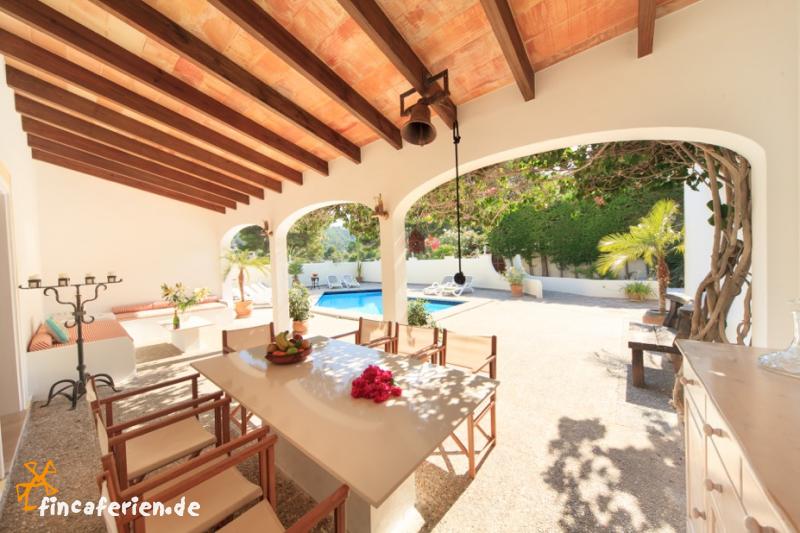 Im Außenbereich lädt die überdachte und wohnlich eingerichtete Terrasse zum Entspannen ein mit Blick zum Pool oder aber zu einem schönen Essen im Freien. Für eine besonders romantische Atmosphäre und mediterranes Flair sorgt der beleuchtete Pool am Abend.