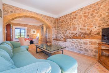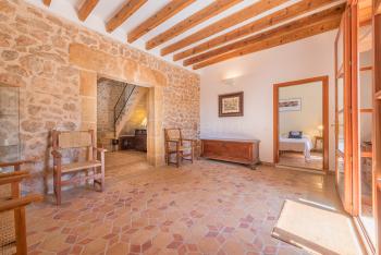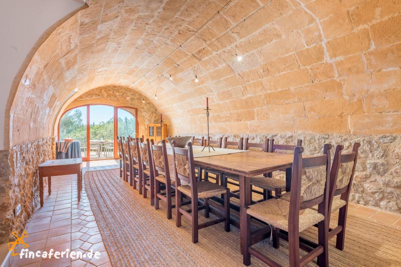 Auch nach der kompletten Renovierung ist der Charme der über 100 Jahre alten Finca erhalten geblieben. Dicke Steinwände, die ehemalige Küche, ein Gewölbe und viele liebevolle Details erinnern an vergangene Zeiten. Auf zwei Etagen stehen den Gästen jetzt 300 m² Wohnfläche zur Verfügung. Hier trifft ursprüngliches, mallorquines Flair auf den Komfort der heutigen Zeit.Durch eine doppelte Tür gelangen Sie in die Eingangshalle. Von hier geht es zur einen Seite in ein Doppelschlafzimmer und gegenüber ein Badezimmer mit Badewanne. Auf der anderen Seite liegt die gut ausgestattete Küche, die zu dem spektakulären Gewölbezimmer mit großem Esstisch führt. Von hier haben Sie direkten Zugang auf die möblierte Terrasse. Auch die ehemalige, mallorqine Küche liegt in der unteren Etage. Am Ende des Flures befindet sich das Wohnzimmer mit Sitzgarnitur, einem Lesebereich und SAT-TV.