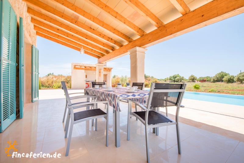 Die teilüberdachte Terrasse auf der Rückseite der Finca bietet einen Essplatz sowie mehrere Sonnenliegen und grenzt direkt an den Pool an. Im Garten gibt es außerdem eine überdachte Grillecke mit Spüle und gemauertem Grill. Hier befinden sich auch das separate WC und eine Außendusche.