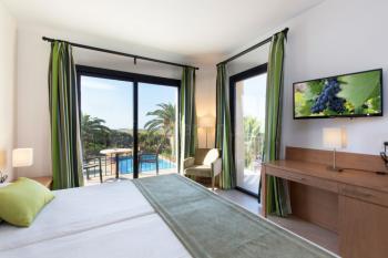 Die geschmackvoll möblierten Zimmer, 43 Doppelzimmer und 12 Junior-Suiten, sind in zwei Gebäuden der Finca verteilt. Alle Zimmer verfügen über Bad/WC, Klimaanlage, Heizung, Sat-TV, Telefon und Balkon. In einem Nebengebäude befinden sich acht großzügig und komfortabel ausgestattete Junior-Suiten, die zusätzlich über Salon und kleine Küchenzeile verfügen. Die Suiten können mit bis zu 4 Personen belegt werden.Das gemütliche Restaurant - ehemals eine Scheune - bietet eine vorzügliche Küche mit der ganzen Vielfalt der mallorquinischen Spezialitäten. Die verwendeten Produkte stammen zum großen Teil aus eigener Produktion der Finca. Zu den Einrichtungen vom Finca-Hotel zählt auch der Aufenthaltsraum mit SAT-TV.