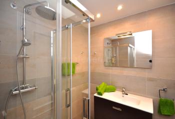 Die strandnahe Ferienwohnung befindet sich im Obergeschoss eines Wohnhauses, hat eine Wohnfläche von ca. 85 m² und ist für 5- 6 Personen geeignet. Zur modernen Ausstattung gehören Waschmaschine, Geschirrspüler, Zentralheizung, Sat-TV und Internet W-LAN. Sollte es in den Sommermonaten einmal zu heiß werden, sorgt eine Klimaanlage im Wohnzimmer und in allen drei Schlafzimmern für angenehme Temperaturen in der Ferienwohnung.Den Gästen stehen drei Doppelschlafzimmer, zwei Badezimmer, eine komplett ausgestattete Küche und ein Wohnzimmer mit Sitzecke und Essplatz zur Verfügung. Vom Wohnzimmer gelangen Sie direkt auf den schattigen Balkon mit Sitzgruppe, Essplatz und schönem Blick auf das Meer sowie den Strand. Eine Treppe außerhalb der Ferienwohnung führt auf die private Dachterrasse mit Sonnenliegen, Waschmaschine, Essplatz und Grill.