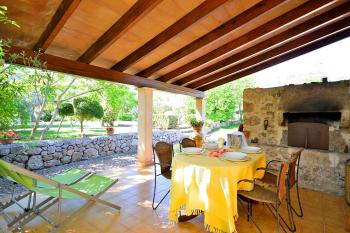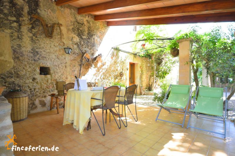 Zum Abschalten und Entspannen lädt der großzügig gestaltete Außenbereich der Finca ein. Es gibt zwei überdachte Terrassen (zusammen ca. 130 qm Fläche) mit Essplatz, Liegestühlen, Backofen und gemauertem Grill. Im gepflegten Garten mit zahlreichen Schattenplätzen liegt der Pool, der von einer Rasenfläche umgeben ist.