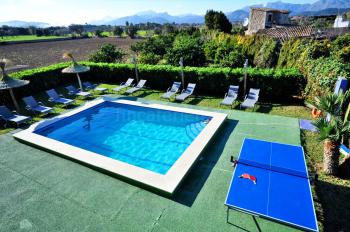 Dieses große Ferienhaus für 12 Personen befindet sich im Norden von Mallorca, in ruhiger Lage auf dem Land, etwa 3 km entfernt von Alcudia. Das zweistöckige Ferienhaus steht auf einem ca. 8.000 qm großen Grundstück und von der oberen Terrasse sieht man in der Ferne die Bucht von Pollenca.Das nahe Alcudia lädt mit typischen Restaurants und Cafes sowie verschiedene Boutiquen und Galerien zu einem Bummel ein. Das Meer und einen schönen Sandstrand in der Bucht von Alcudia erreicht man nach ca. 4 km. Für die Anfahrt vom Flughafen nahe der Hauptstadt Palma de Mallorca benötigt man ungefähr 58 km.