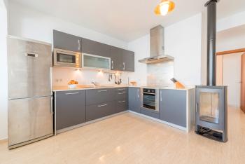 - offene Küche mit Ceranfeld, Backofen, Kühl-/Gefrierkombination, Geschirrspüler, Mikrowelle, Kaffeemaschine, Toaster etc