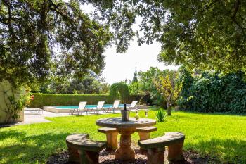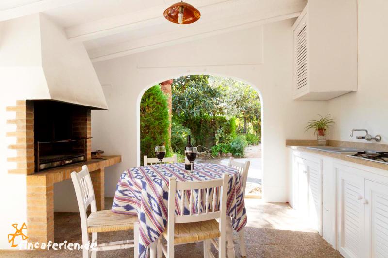 Vom Wohnzimmer gelangt man zum Pool mit Sonnenterrasse und in den Garten mit zwei uralten, schattenspendenden Steineichen, einigen Palmen sowie Orangen-, Zitronen- und Olivenbäumen. Am Hauseingang liegt die überdachte Terrasse mit Essplatz und gleich daneben eine Außenküche mit gemauertem Grill, Gasherd und Spüler. Hier befindet sich auch das Außenbad mit Dusche.