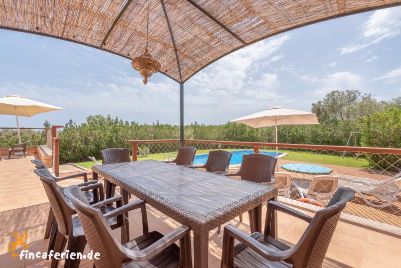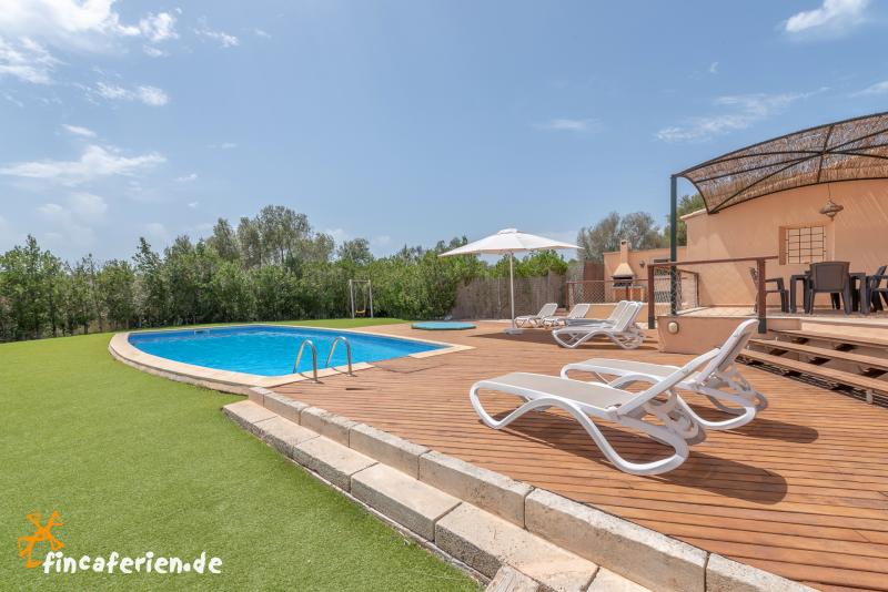 Sowohl von der Küche als auch vom Wohnzimmer gelangt man auf die Terrasse. Bequeme Sitzgelegenheiten stehen hier bereit, um zu lesen oder entspannt den Tag ausklingen zu lassen. Nur ein paar Schritte sind es von der überdachten und möblierten Terrasse bis zum relativ großen Pool. Dieser ist von Kunstrasen und einer Holzterrasse umgeben, auf der ausreichend Sonnenliegen zu einem entspannten Urlaubstag am Pool einladen. Außerdem gibt es einen gemauerten Außengrill und einen Essplatz für 6- 8 Personen.