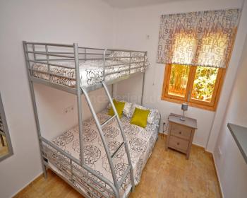 Die ebenerdige Ferienwohnung hat eine Wohnfläche von ca. 75 m² und ist für 6 Personen geeignet. Zur komfortablen, modernen und zweckmäßigen Einrichtung gehören 3 Schlafzimmer, Klimaanlage warm/kalt, Spülmaschine, Internetzugang und SAT-TV. Die Küche und das Wohn-/Esszimmer haben einen Zugang zur möblierten Terrasse.Eine Besonderheit der Ferienwohnung ist das Etagenbett des einen Schlafzimmers mit unterschiedlichen Bettengrößen. Das untere Bett entspricht einem französischen Bett, während das obere die Größe eines normalen Einzelbettes hat.